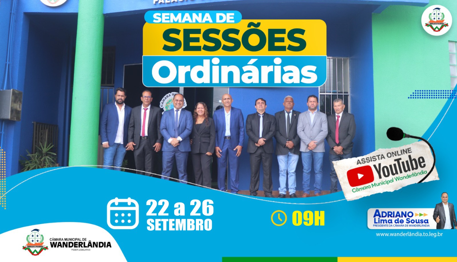 O Presidente da Câmara Municipal de Wanderlândia, Adriano Lima de Sousa, convida toda à população wanderlandense, para participar das Sessões Ordinárias, que serão realizadas no mês de setembro. As sessões acontecerão nos dias 22, 23, 24, 25 e 26, com início às 09h00min, no Plenário José Maurício Viana de Medeiros.